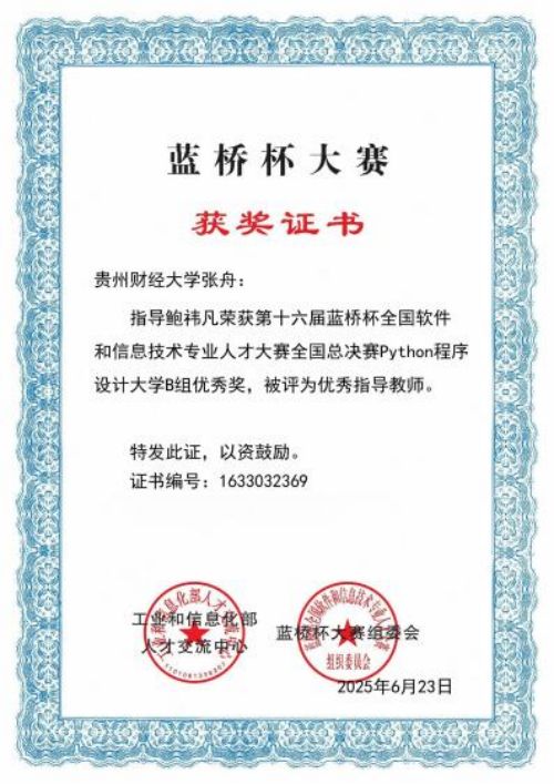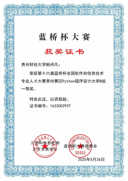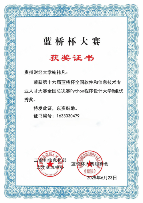 近日,第十六届蓝桥杯全国软件和信息技术专业人才大赛电子赛圆满落幕,bevictor伟德官网2023级工程管理专业员工鲍祎凡(指导老师:张舟)在斩获佳绩,荣获贵州赛区Python程序设计大学B组一等奖晋级全国总决赛。在高手如云的国赛赛场上,鲍祎凡同学沉着冷静、稳定发挥,经过紧张激烈的比赛,荣获全国总决赛Python程序设计大学B组优秀奖,实现了公司在该赛事上的突破。