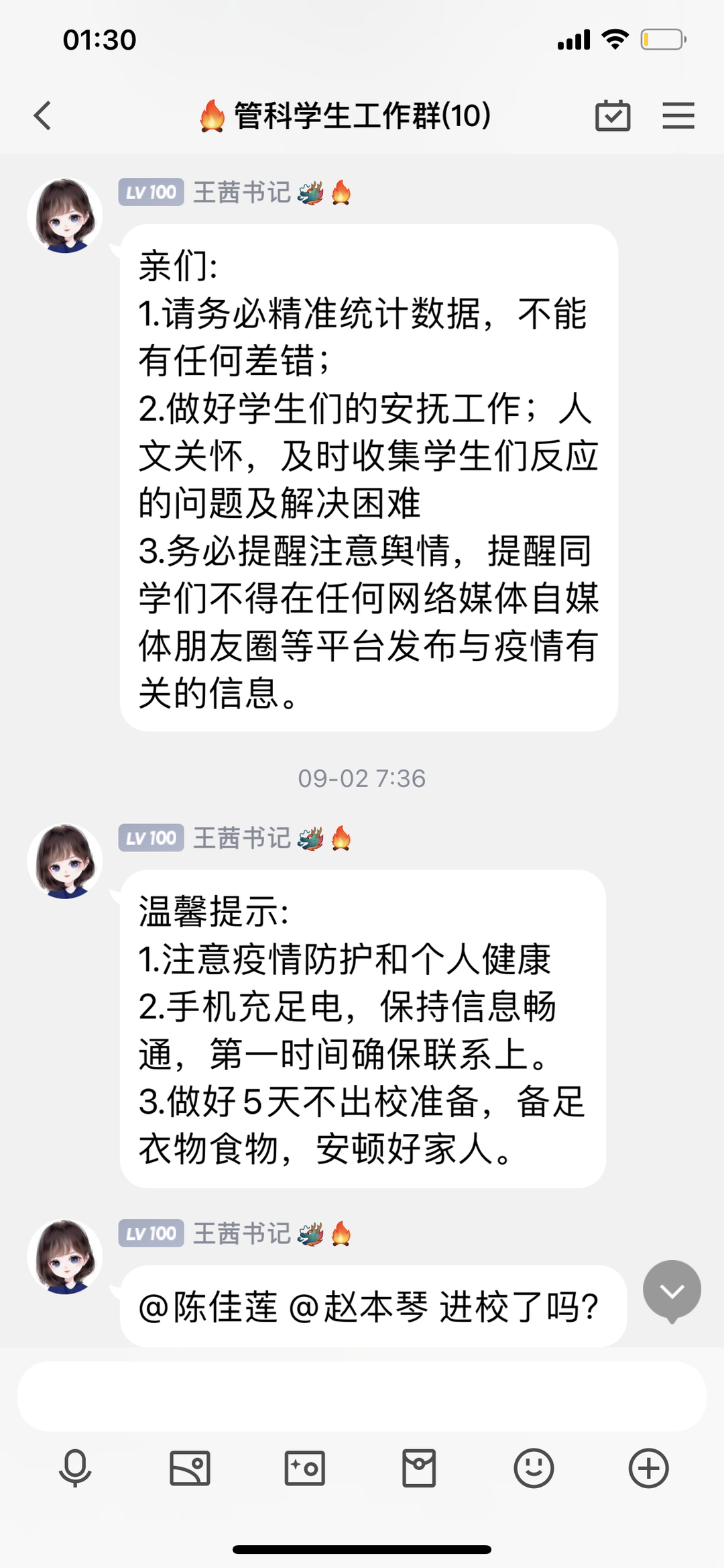 在实行静默管理期间,bevictor伟德官网的领导和老师以身作则,挺身而出。9月1日晚至今,管科公司返校到岗的领导老师有党委书记邵新顺、已调往招就处但仍在履行员工管理职责的原党委副书记王茜、员工科负责人李炳芳、专职组织员罗红艳,以及辅导员陈佳莲、姚吟吟、吴德凤、曾建霞(新入职的专任教师)等八名同志按照公司的统一安排部署,展开了所负责点位的全员核酸检测工作,并到员工宿舍走访进行思想政治工作,及时将公司的通知要求传达到公司师生。因静默管理不能到校的辅导员吴沛丽、赵本琴、院办公室副主任赵湘婷、教务科科长朱艳飞在家线上办公,公司党政领导班子其他成员及科室负责同志按照分工共同做好了相关工作。