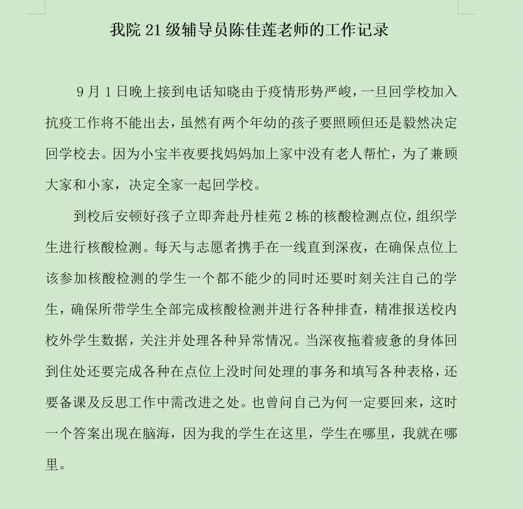 一条条消息、一通通电话、一份份数据、一丝丝叮嘱、一份份关怀,这些都是他们亲力亲为这场疫情防控做的他们觉得微不足谈的小事情,但恰好是这些“小事情”,科学、规范、严密地做好公司的疫情防控任务,防控工作有序开展,同时也给我们同学们上了一堂堂生动的思政教育课。