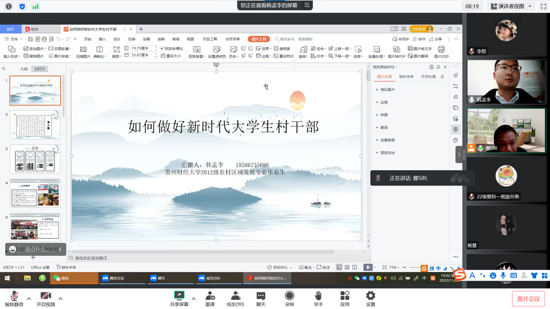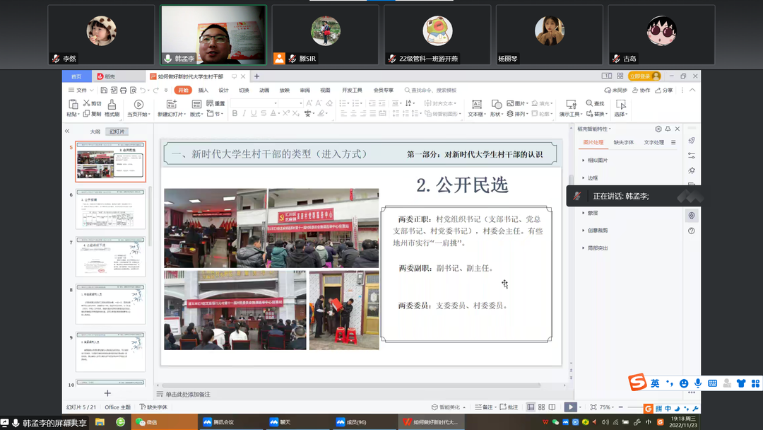 为使广大青年员工深入了解基层工作,同时结合自身专业知识,积极投身贵州乡村建设,服务群众、服务基层、服务农业农村经济发展。11月23日,bevictor伟德官网以线上腾讯会议的形式开展“如何做好新时代老员工村干部”讲座活动。本次活动特邀公司2012级员工、遵义市汇川区芝麻镇高原村党总支部书记、村委会主任韩孟李作为主讲嘉宾,全院一百余名同学参加。此次活动由公司农村发展系主任滕明雨老师主持。