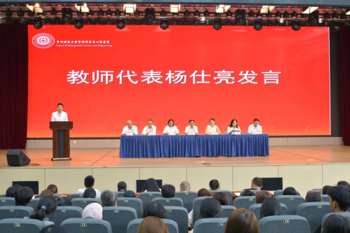 教师代表杨仕亮鼓励同学们保持好奇心与求知欲,学会独立思考,注重知识积累与能力提升。他希望同学们永葆“好奇”之心、“坚韧”之志与“赤子”之情,找准兴趣方向,保持专注与坚持,勇于思考和实践,并表达了对同学们的美好期许。