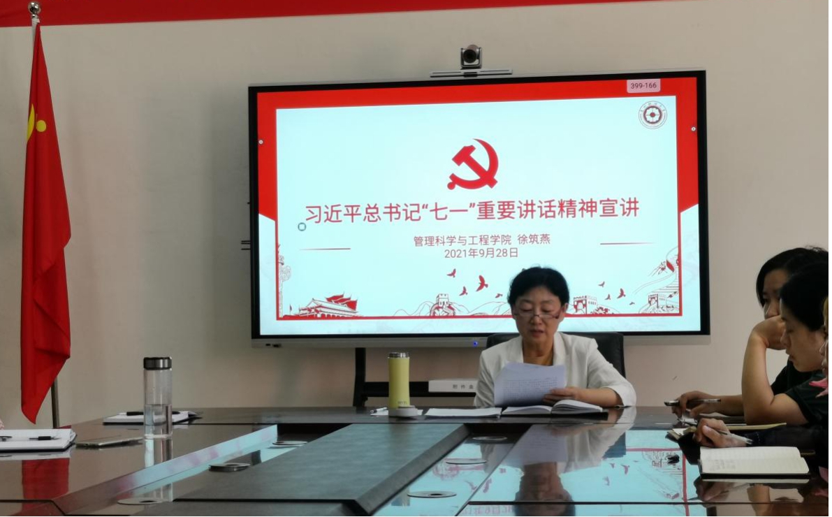 徐筑燕紧紧围绕习近平总书记“七一”重要讲话精神,从习近平总书记“七一”重要讲话的政治意义、理论意义、实践意义等三个方面对习近平总书记七一重要讲话精神重大意义和深刻内涵进行了系统深入、全面准确的解读。她表示,应坚持和加强党对高校的全面领导、坚持社会主义办学方向、深入落实立德树人根本任务、坚持以人民为中心的发展思想、坚持强化马克思主义理论团队建设、增强防范化解意识形态领域风险挑战的能力、坚持加强党的建设,不断从习近平总书记重要讲话中汲取管党治党、办学治校的智慧和力量。