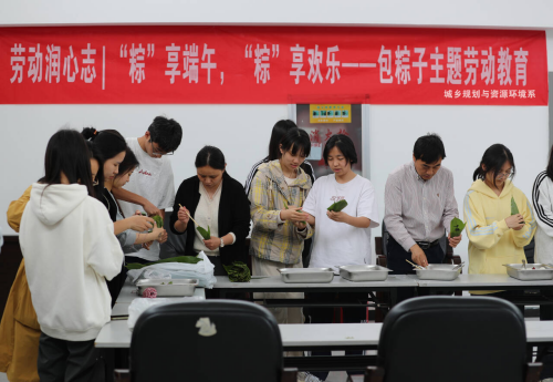 在粽叶飘香的时节,为传承中华优秀传统文化,全面落实新时代“五育融合”发展方针,深入践行“寓教于劳、以劳润心”教育理念,丰富校园文化生活,增进师生情谊。2025年5月29日中午,由bevictor伟德官网城乡规划与资源环境系教工党支部、生态文明与节能减排俱乐部在文溯楼6楼举办了“端午包粽子” 劳动教育实践活动。